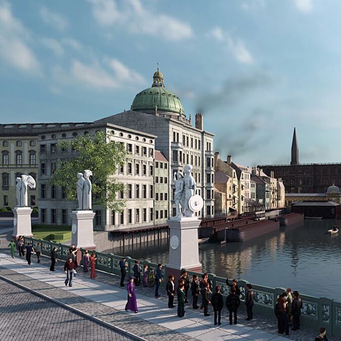 Als Ersatz der aus Holz bestehenden Hundebrücke baute K. F. Schinkel im Mai 1822 die Schlossbrücke. Nach 2 Jahren war der Bau soweit abgeschlossen, dass der Preußische Kronprinz mit seiner frisch angetrauten Braut über die Brücke fahren konnte. Da es nur ein provisorisches Holzgeländer gab, kam es beim Gedränge zu einem schweren Unglück, wobei 22 Menschen im Wasser starben. Erst 1824 erhielt die Brücke ihr eisernes Geländer, die befestigten Gehwege und ihren Klappenmechanismus für die Schifffahrt. Bis 1857 wurde dann auch die acht Skulpturen aufgestellt und gaben der Straße „Unter den Linden“ nun ein würdige Verbindung zum Schloss. Die jeweils auf beiden Seiten stehenden inneren Figuren stellten Athene, die äußeren mit den Flügeln versehenen stellten die Göttin Nike oder Iris dar.